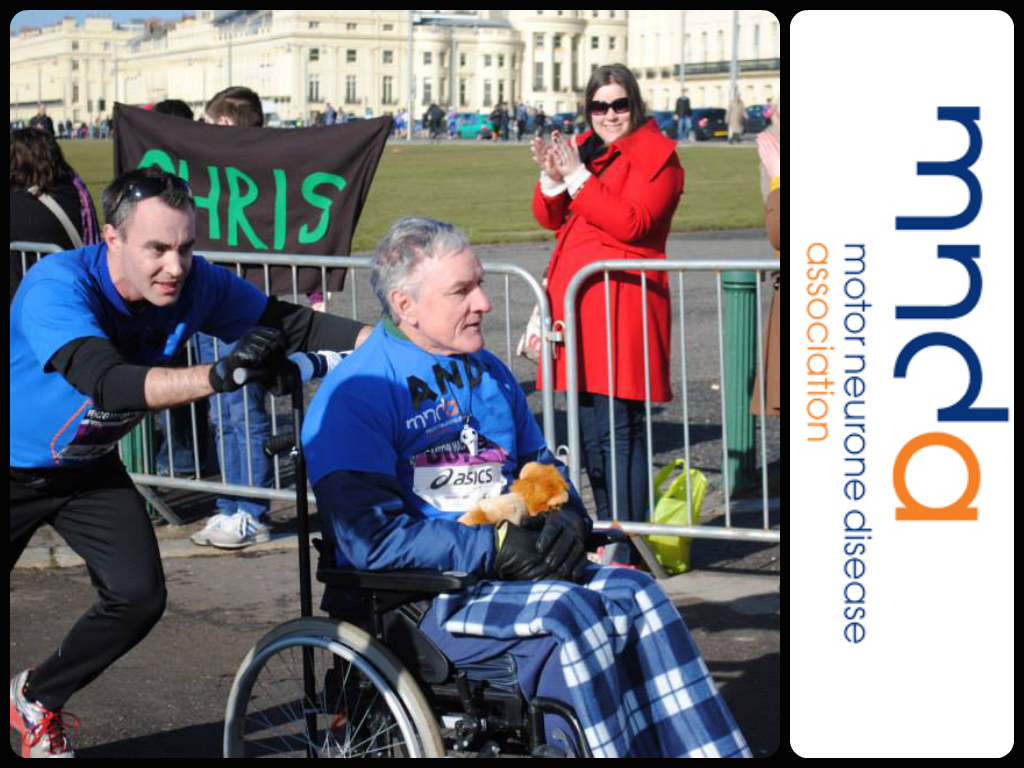 From the onset, life span is expected to be two-to-five years. One night it struck me that although he couldn’t run anymore, not even for a bus, he could still race if I pushed him, in his NHS wheelchair. We did Brighton Marathon together last year in 4h22.
