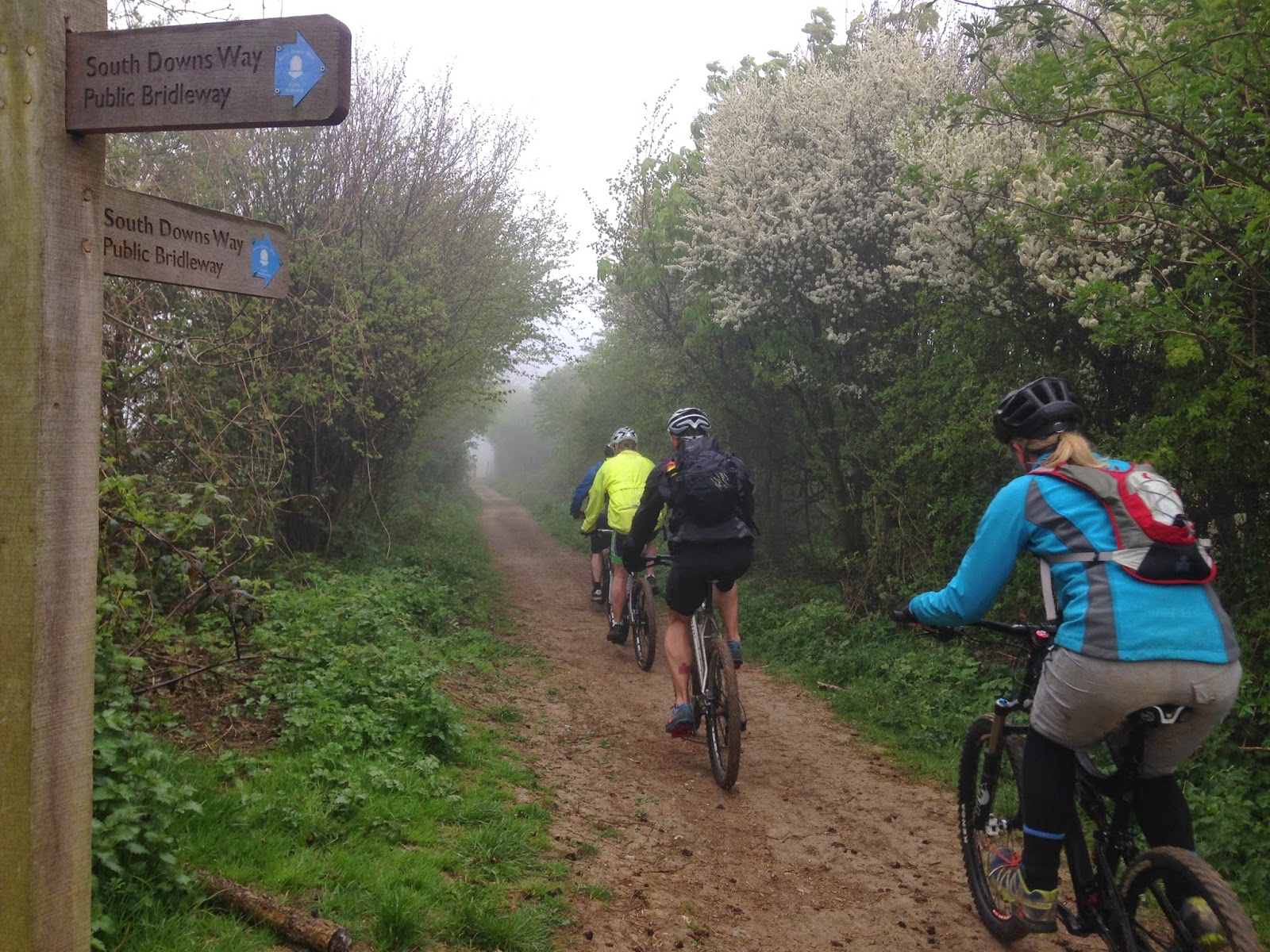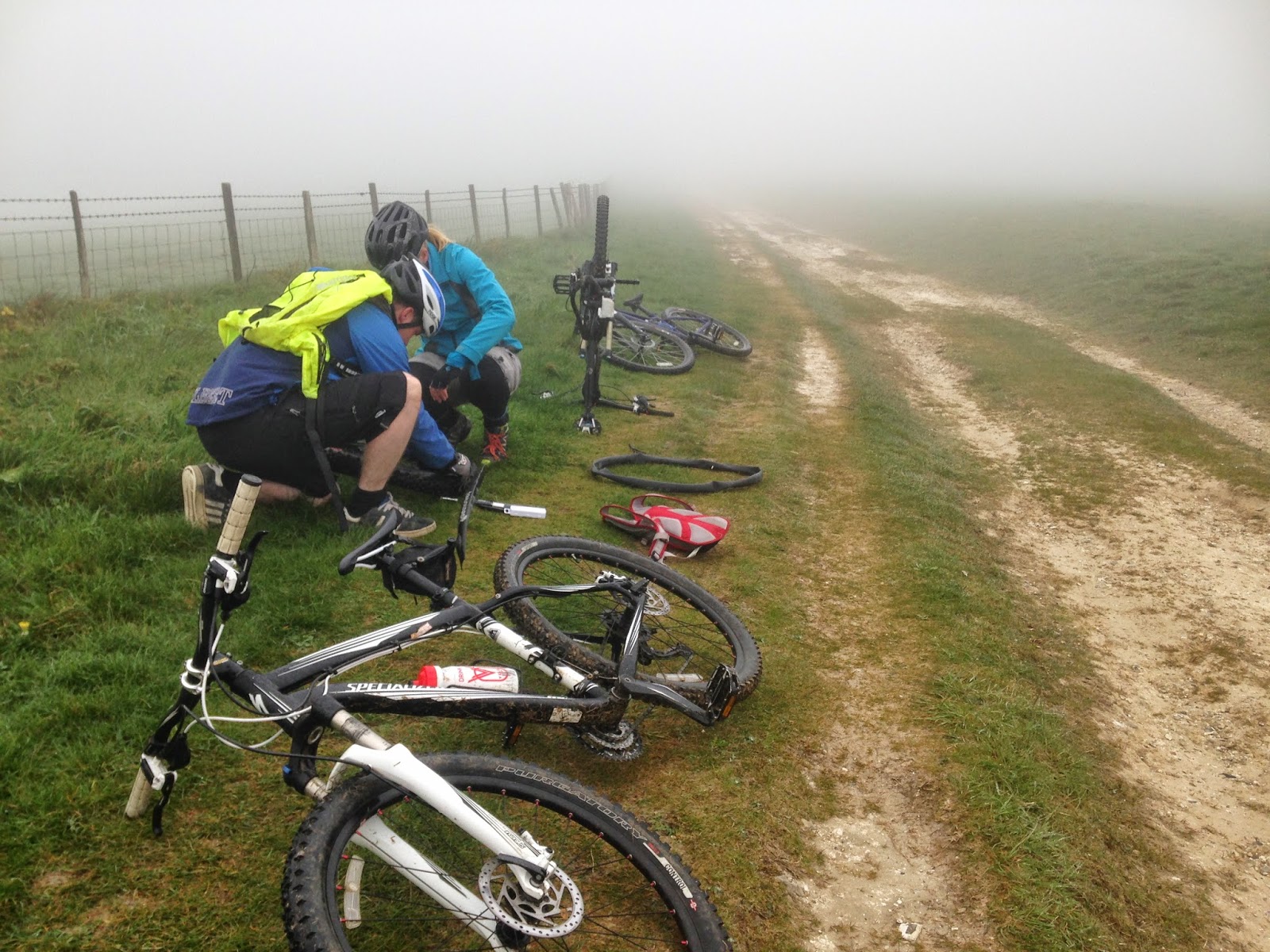 Another fun, hilly, mountain bike adventure, with three punctures in total and views once again shrouded in mist at the top of the Downs for the most of the ride.