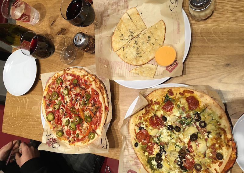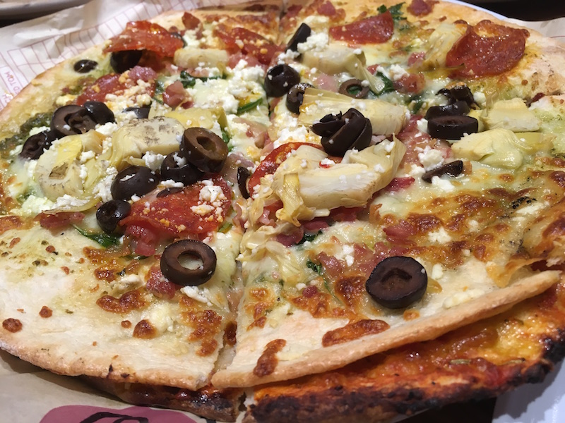 I had the Seasonal MOD, which was pesto, rocket, mozzarella, bacon, artichoke jalapeno and feta, and I added pepperoni to it because I can’t live without pepperoni on my pizza. Chris had the Mad Dog and added some bits to it but I was too busy salivating over mine to notice what.